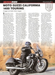 Ultimate Motorcycling published two articles so far about the California 1400 Touring. The first one was a brief “first ride” summary dated November 18th, and the second was a full review published 3 days later, both by Tor Sagen. He described the bike as “the most comfortable beast ever to leave the Mandello del Lario factory gates”. Comfort is a repeating theme with all the reviews so far. He goes on to call the previous model California Vintage “cramped” and described the California 1400’s leg room as a “big comfort upgrade”.