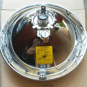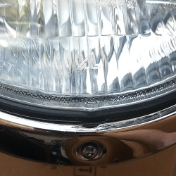 Moto Guzzi California Headlamp After cleaning the inside of the lamp and using a hair dryer to blow out any dust specs, I then installed the new bulb and fastened the wire clip that retains it. I had removed the metal bezel from the lamp by removing the 8 wire clips in hopes that I could remove the glass lens from the reflector housing. It doesn’t work that way though.  There is a rubber gasket that seemed sealed quite well, so I didn’t dare try to separate the glass and reflector. I simply reinstalled the bezel with the wire clips exactly the same way and same position they were in before.