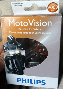 The original equipment headlight bulb in my Vintage was an H4 Osram Bilux 64193 made in Germany. This is a standard automotive bulb. To try something different (in the spirit of hopefully improving my safety on the road) I decided to replace the Osram bulb with a Philips MotoVision bulb. The Philips MotoVision bulb is a high performance, vibration-resistant, Halogen bulb that was specially designed for motorcycles. Honestly, I never knew there was such a thing.  I suspect most riders aren’t aware of this bulb either.  Anyway, the main thing is that the MotoVision bulb is DOT compliant and provides “white light with orange effect” to help motorcycles stand out in traffic.